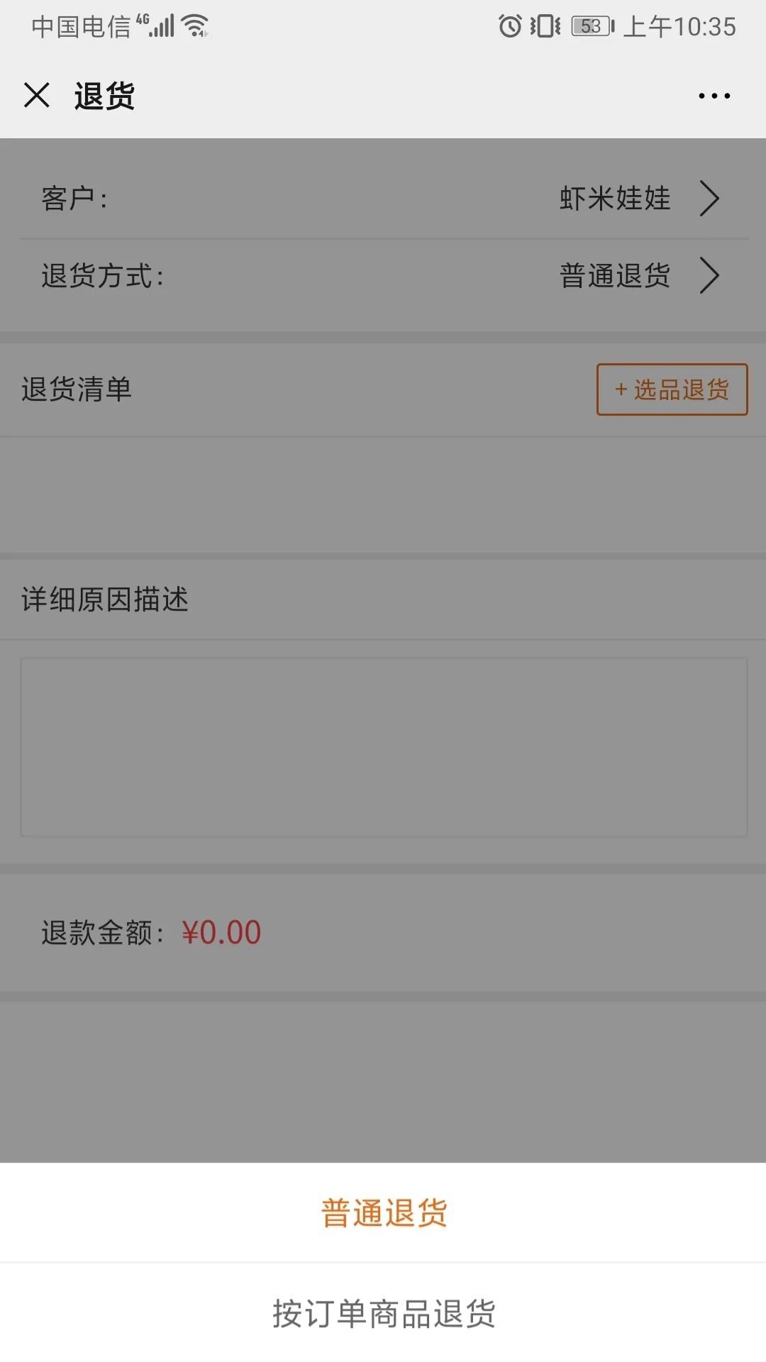 業務員可以在手機端為客戶辦理普通退貨或按訂單商品退貨,優化業務員服務體驗。