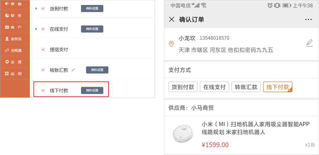 線下付款功能同樣支持例外設置,配置以后,客戶下單結算時即可選擇線下付款。