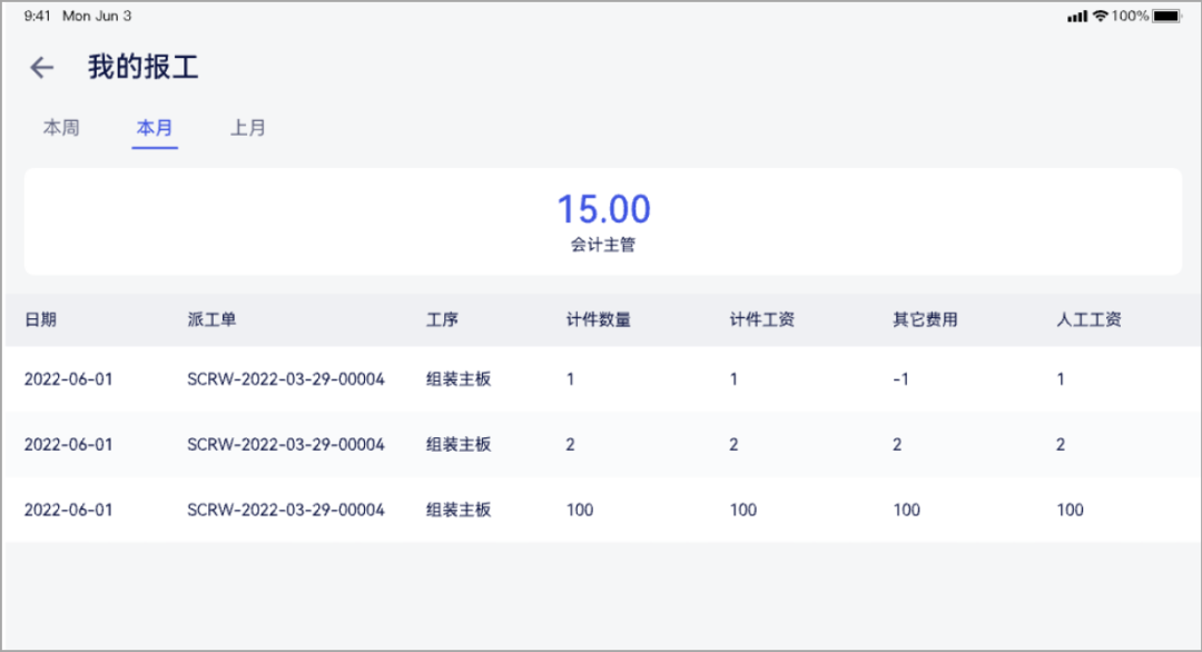 我的頁面中,增加我的報(bào)工查看,可查看操作員本周、本月以及上月的計(jì)件工資,同時可查詢計(jì)件工資的組成明細(xì)。