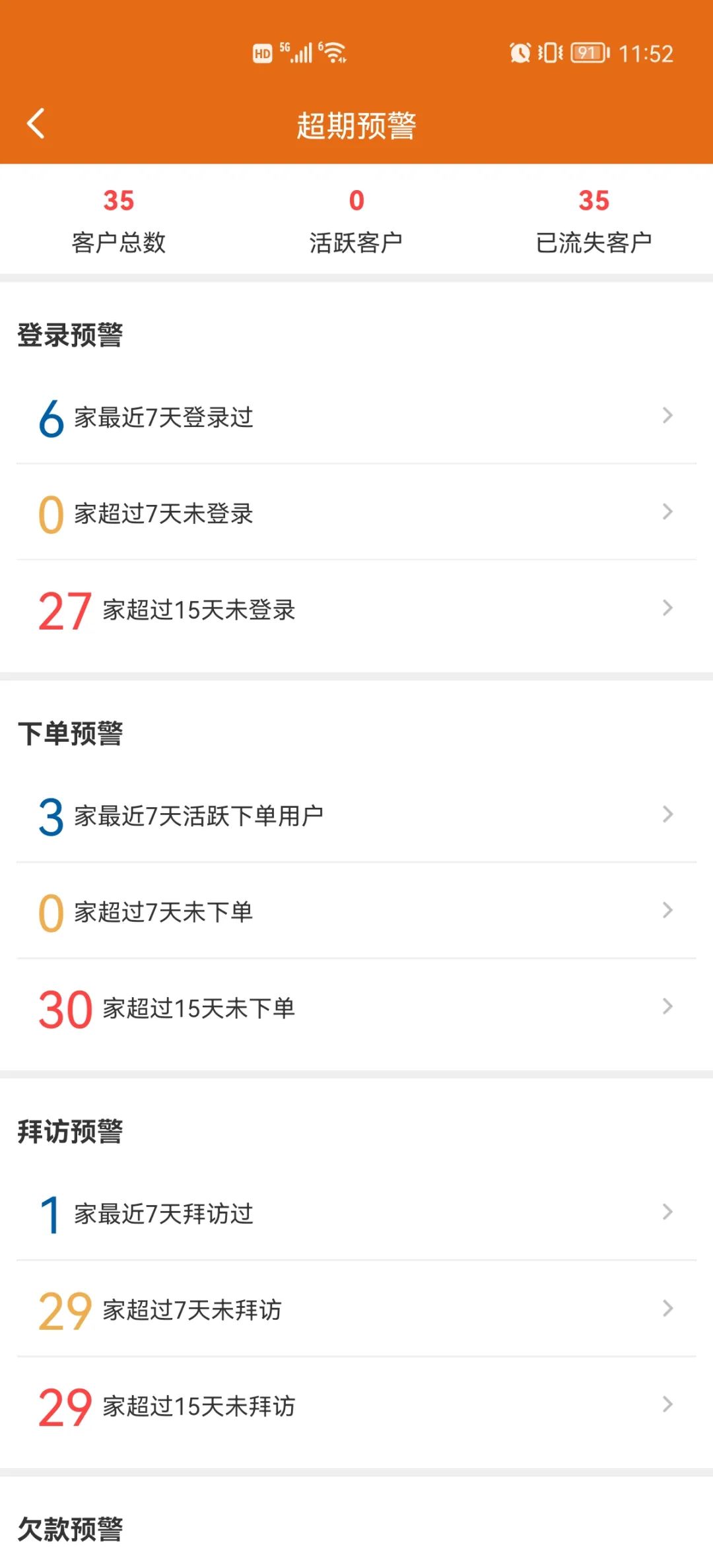傳統(tǒng)老板,經營多年,已經積累了不少客戶,但要清楚掌握客戶情況,比如手上總共有多少客戶,有多少活躍客戶,客戶有多少天沒登錄, 多少天沒下單,有多少欠款,靠傳統(tǒng)的方式很難區(qū)分出來,但通過快馬超期預警能夠很清楚掌握客戶情況。