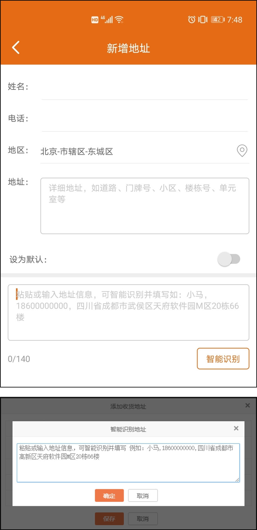 在全局所有添加地址地方支持智能識別地址,提高添加效率