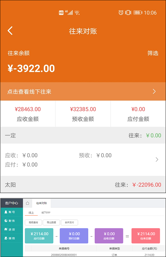 PC端、移動端客戶中xin新增客戶自查線上往來對賬,同時(shí);移動端管理中xin新增業(yè)務(wù)員查詢管轄客戶線上往來對賬