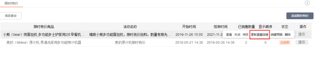 對正在進(jìn)行限時(shí)特jia、拼團(tuán)活動中的商品,在直播時(shí)可復(fù)zhi活動鏈接到直播平臺進(jìn)行推廣,也可用非活動鏈接進(jìn)行商品正常售價(jià)直播;促銷中的商品直播時(shí)則自動顯示活動價(jià)