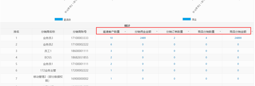 將原來分銷排名中xin修改為分銷統(tǒng)計(jì)中xin,并對統(tǒng)計(jì)排名數(shù)據(jù)進(jìn)行優(yōu)化, 方便管li員查看分銷商邀請客戶數(shù)量、分銷傭金金額、分銷訂單那數(shù)量、商品分銷數(shù)量、商品分銷金額等數(shù)據(jù)及明細(xì)